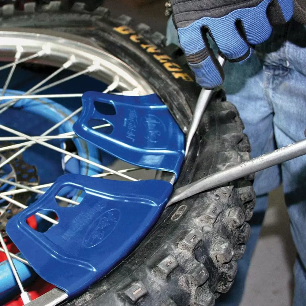 Universal RimShield 2 Wheel Protector by Motion Pro. Prevents rim damage from tyre levers during tire changes. Dual raised beads facilitate inserting tire lever under tire bead and prevent tyre lever from slipping. Durable Dupont® Zytel nylon construction won’t mar wheels. Finger holes make it easy to insert and remove. The long apron protects hands and spokes.