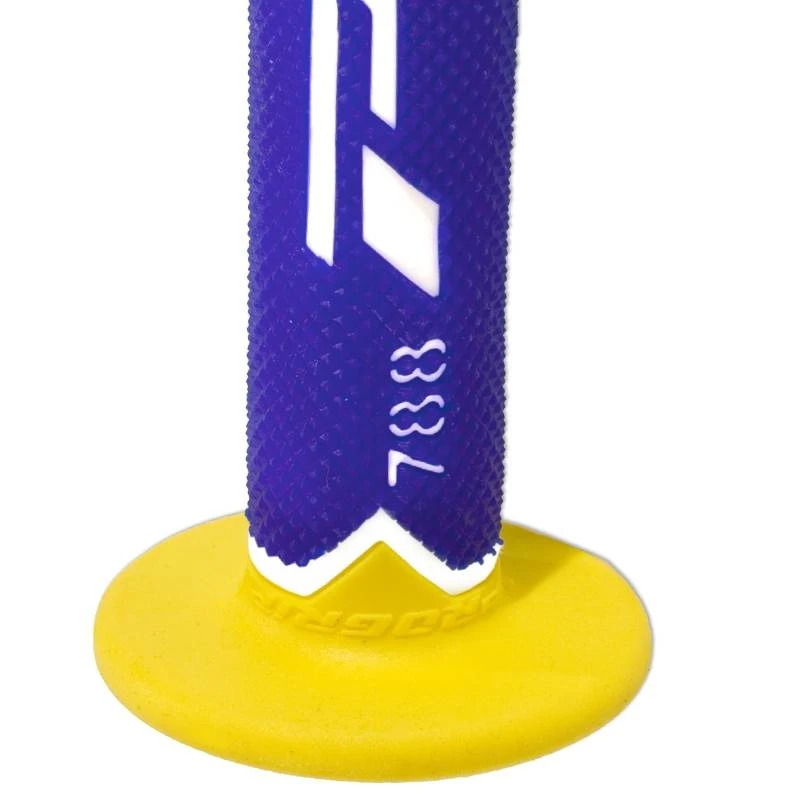 ProGrip 788 Triple Density Grips in Limited Edition White Blue Yellow design consists of three rubber components: a hard inner shell for slide-free grip on the handlebars, gel where vibration needs to be dampened, and medium-hard rubber on the ends for better control over the bike.