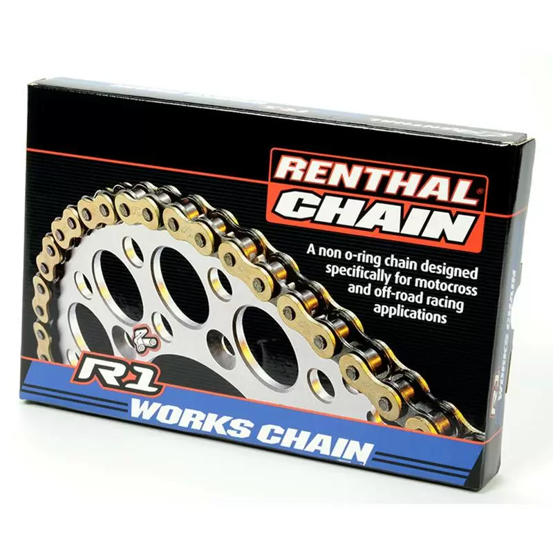 R1 MX Works Chain By Renthal. The R1 Chain is a premium high strength off-road motocross chain with excellent impact load resistance, designed specifically to withstand the stresses found in off road applications. This chain is the choice where a combination of high strength, light weight and maximum power transfer are important considerations.