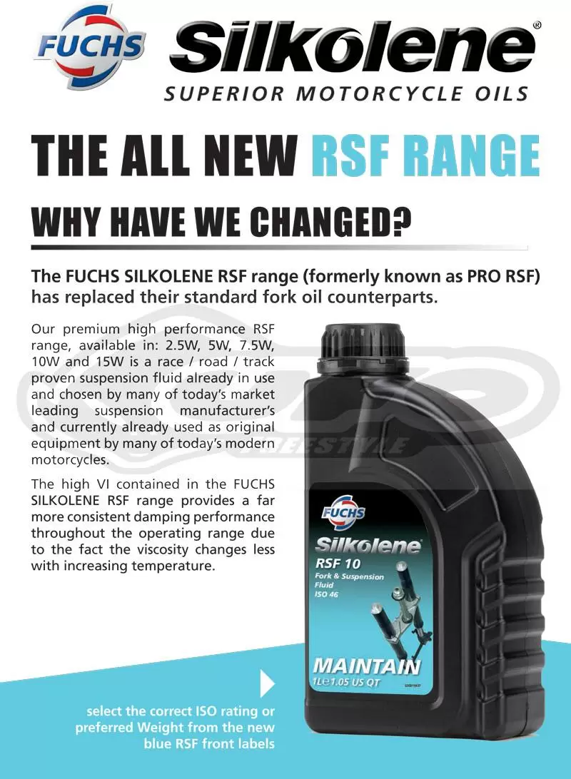 The SILKOLENE RSF RANGE is designed for the latest competition suspension systems as well as modern suspension systems fitted to road going bikes. They have been used by factory race teams and suspension specialists in Road Racing, Off Road and in normal road use with exceptional results. The SILKOLENE RSF RANGE of fluids has been used successfully in the following suspension systems: Penske, Proflex, Ohlins, W.P. and Showa.